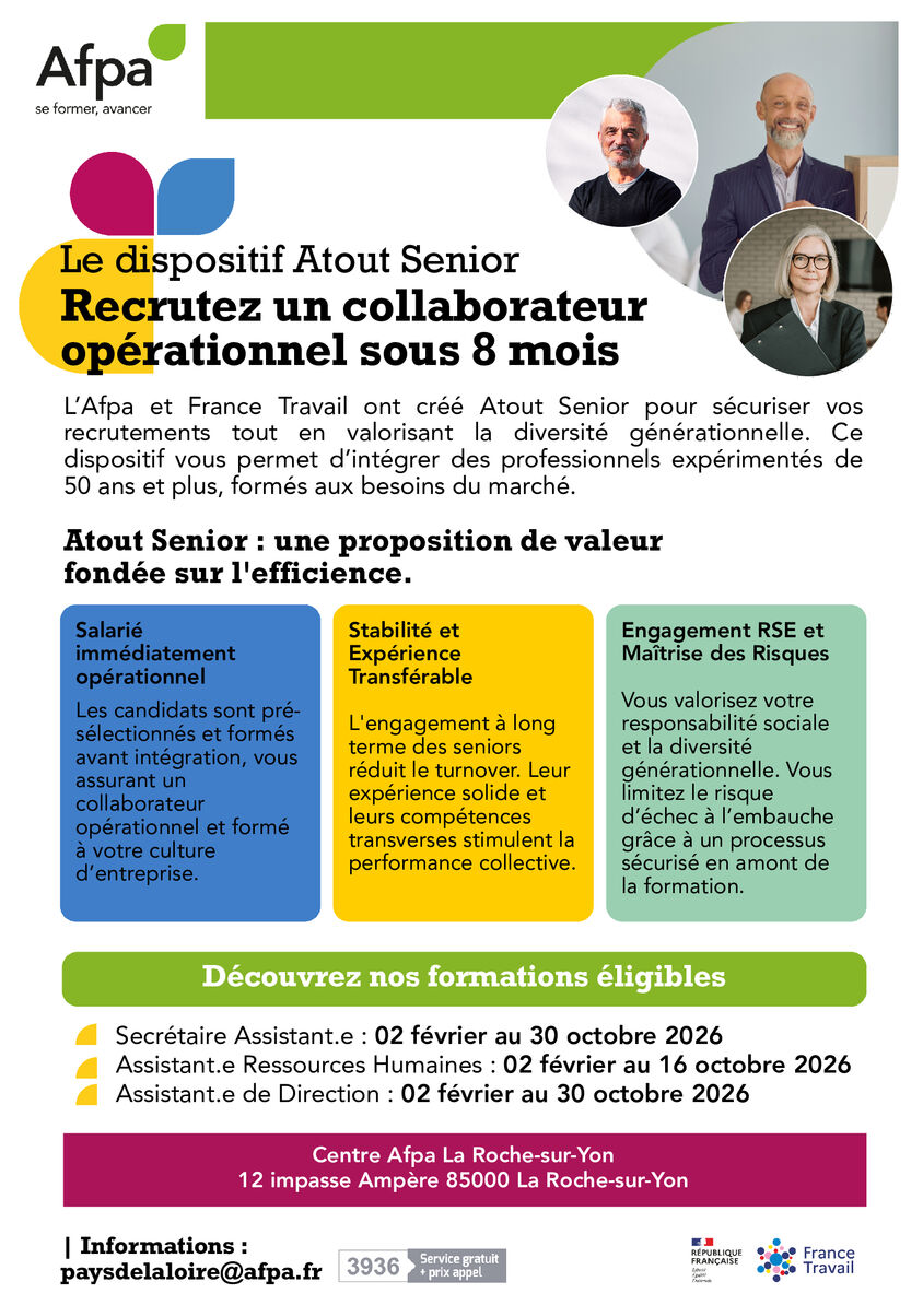 Avec Atout Sénior, sécurisez vos recrutements et misez sur l’expérience ! L’Afpa et France Travail vous offrent l’opportunité d’intégrer des talents de 50 ans et plus, formés aux compétences clés du marché. Valorisez la diversité générationnelle et gagnez en performance !