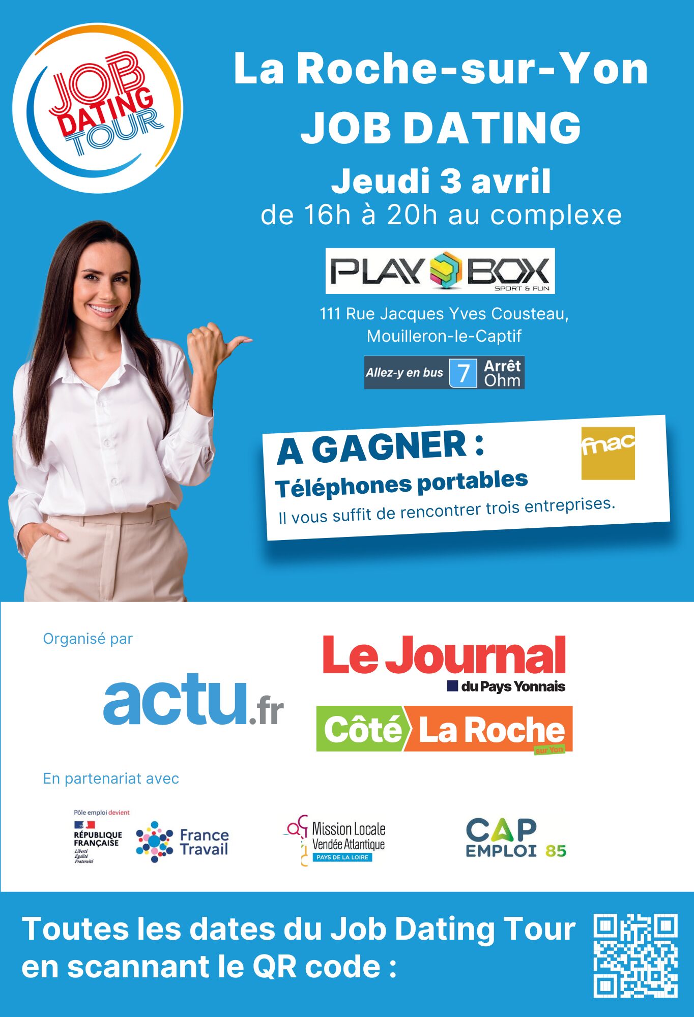 Évènement dédié au recrutement et à l’emploi, le job dating tour de La Roche Sur Yon est de retour. La deuxième édition, organisée par Actu.fr et Le Journal du Pays Yonnais, aura lieu le jeudi 4 avril à Play Box.